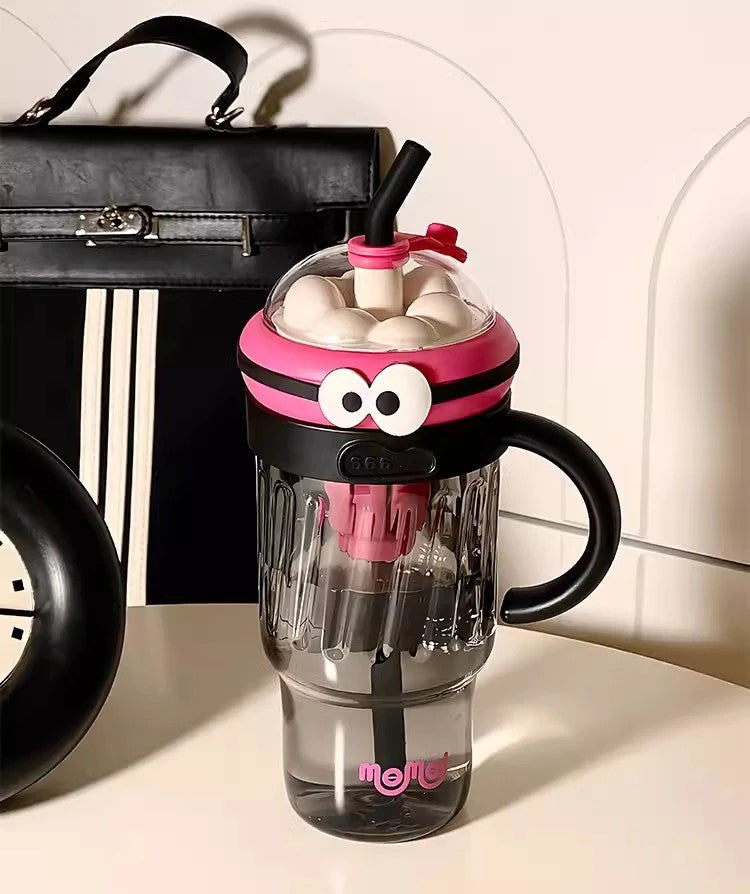 This adorable monster-themed straw cup features a fun, cartoon-style design with big expressive eyes and a bold pink-and-black color scheme. It is designed for kids, teens, and adults who enjoy playful drinkware with personality. The transparent textured cup body provides a modern aesthetic while allowing you to see the drink level easily.