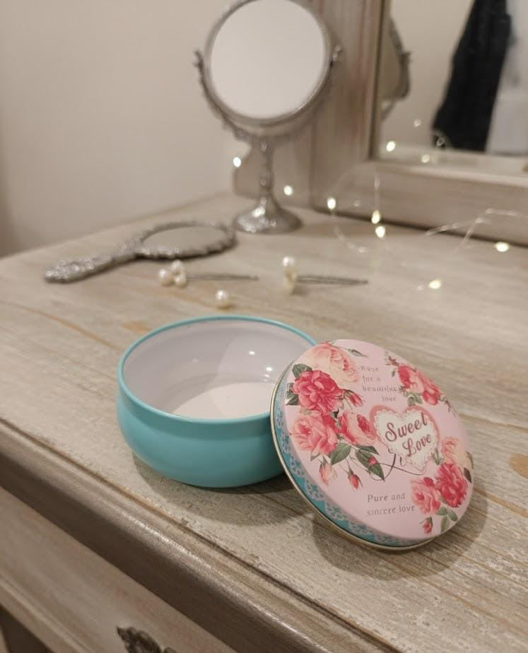 Create a warm and elegant ambiance with this beautiful scented candle packed in a pastel blue tin with a floral printed lid. Featuring a charming “Sweet Love” design, it adds a romantic and luxurious touch to your bedroom, vanity setup, living room, or spa corner.