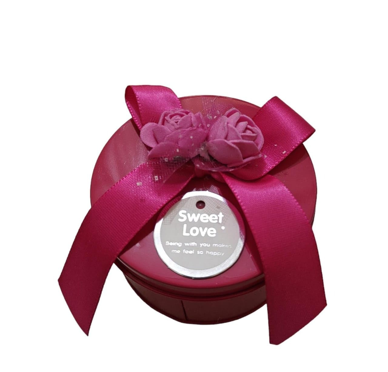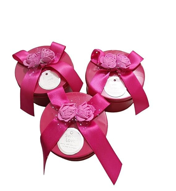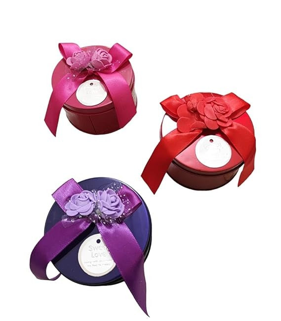 Add a touch of elegance to your gifting with these beautiful round tin boxes, adorned with pink satin ribbons and floral decorations. Perfect for chocolates, dry fruits, candies, or return gifts, these tins combine style, charm, and practicality.