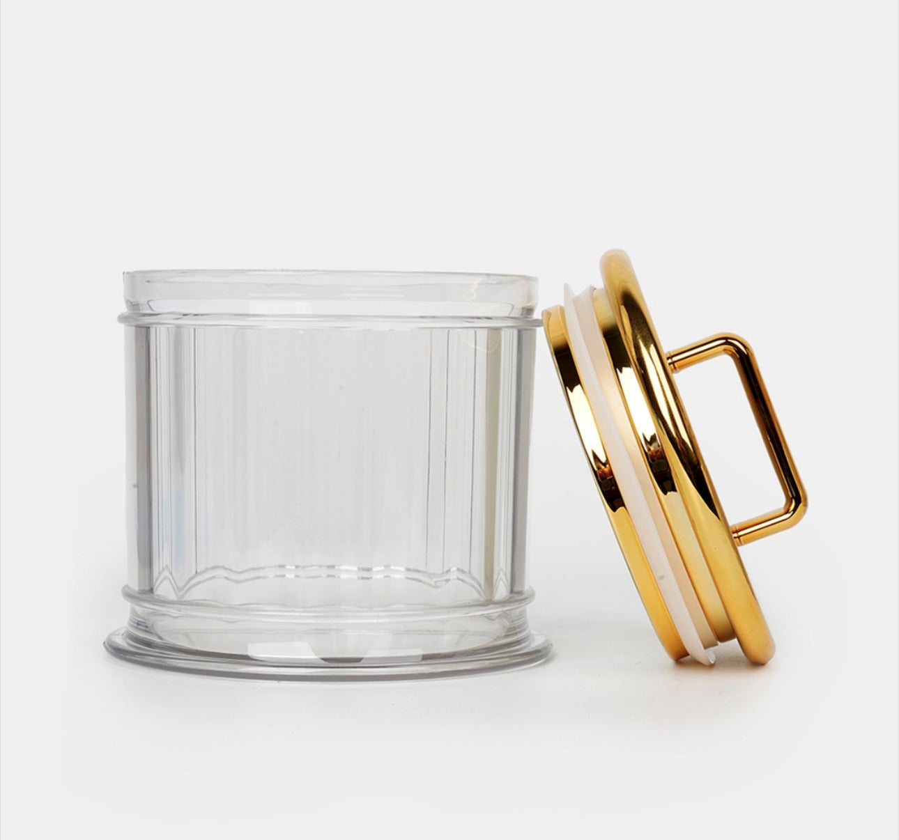 This elegant clear storage jar is designed to combine premium aesthetics with everyday functionality. Crafted from high-quality transparent material, the jar features a beautifully ribbed, glass-cut styled body that adds a touch of luxury to any space. The standout feature is its metallic gold lid, polished to a glossy finish and equipped with a sturdy rectangular handle for easy lifting and secure closure.