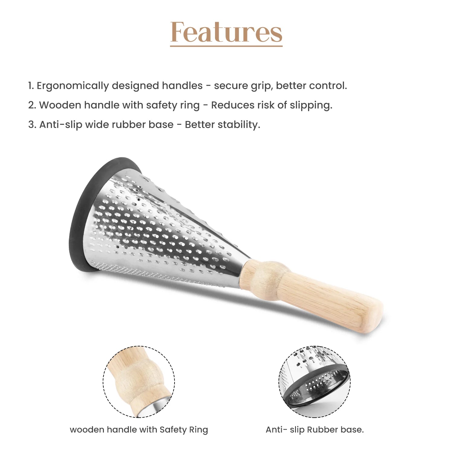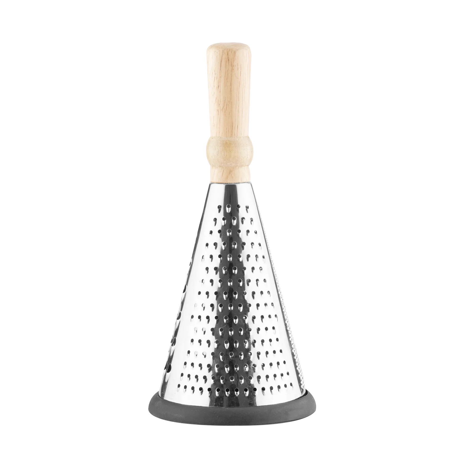 It features a smooth wooden handle for a firm, ergonomic grip and a non-slip rubber base for stability while grating.