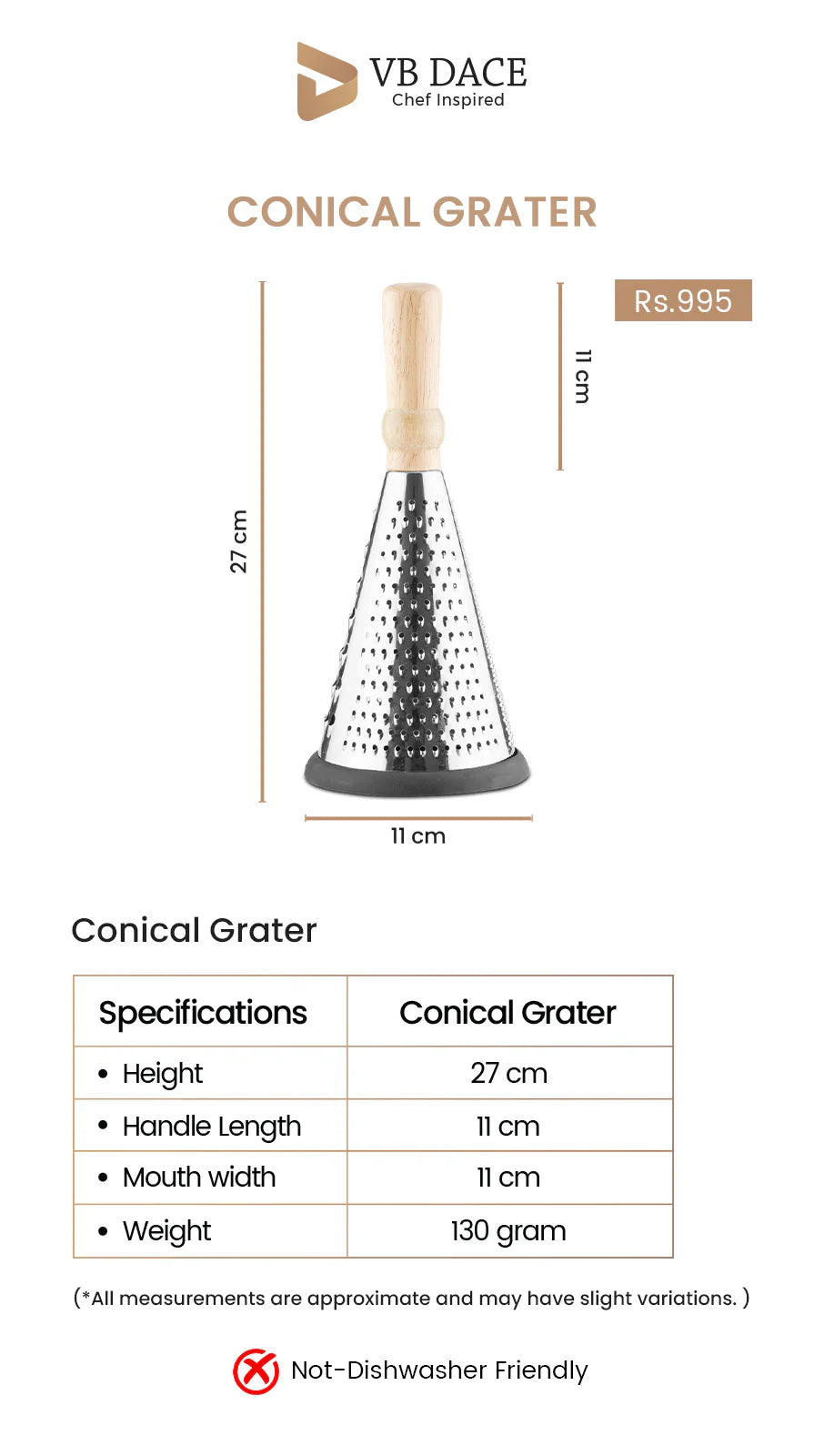 This is a premium stainless steel cone grater designed for efficient and comfortable kitchen use. The cone-shaped body provides multiple grating surfaces, ideal for shredding vegetables, cheese, ginger, garlic, chocolate, and more.