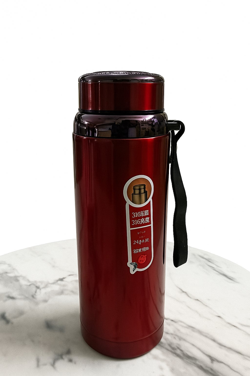 Its sleek red metallic finish gives it a modern look, while the leak-proof lid and carry strap make it convenient for travel, office, gym, or outdoor adventures. Ideal for tea, coffee, or water, this flask combines functionality with style.