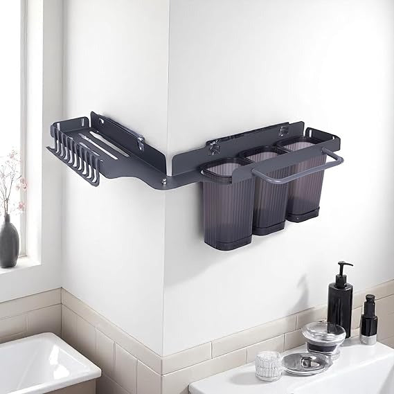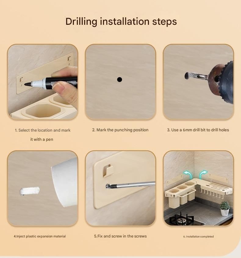 This image showcases a beige/light-coloured, wall-mounted, multi-functional kitchen organizer designed to utilize corner space efficiently. The organizer features a foldable or rotating hinge in the center, allowing it to be configured along two adjacent walls.