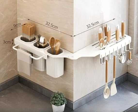 The left section consists of three compartments/slots, likely intended for storing chopsticks, spoons, forks, or other small utensils, with a built-in towel or rag bar underneath. The right section is a shelf with slotted openings on top, ideal for holding knives or cutting boards, and includes multiple hanging hooks along the bottom for spatulas, whisks, or kitchen towels.
